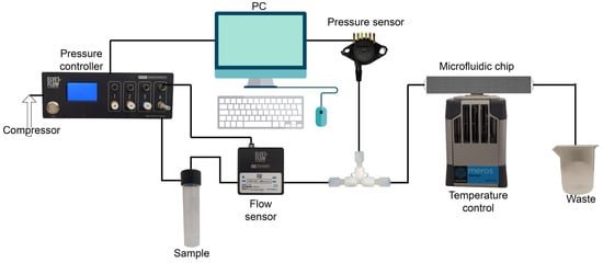 In order to operate, the controller requires an external pressure source, namely a compressor. The pressure controller directs compressed air into a sealed reservoir containing the displacement fluid under study. The microfluidic chip was connected to the reservoir via PTFE tubing with an outer diameter of 1/16 inch and placed horizontally. The temperature in the experiments was maintained constant at 25 °C using a TCU-100 microfluidic temperature control (Dolomite Microfluidics, Royston, UK). The temperature control of the microfluidic temperature controller ranged from 0 to 100 °C. The accuracy of temperature measurement was ±0.1 °C. The microfluidic chip was covered on the top with insulation to achieve more stable temperature conditions.