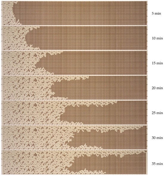 Further, a series of microfluidic oil displacement experiments were conducted using suspensions of spherical silicon oxide nanoparticles with an average size of 22 nm (Ludox TM-50, Sigma Aldrich). The flow rate of the suspensions during the displacement process was identical to that in experiments with water, equaling 0.5 μL/min. The oil displacement dynamics from the microchip by nanosuspension with a particle concentration of 2 wt% are illustrated in Figure 6. A comparison of Figure 5 and Figure 6 reveals a change in the character of the interface front movement. The flow of nanoparticle suspensions occurs in the form of separate jets, similar to those observed when displacing oil with water. However, the width of these jets increases significantly (Figure 6). Moreover, the channels through which the nanosuspension flows encompass a greater proportion of the microchip volume. In contrast to the predominantly walls-directed flow of water, the nanosuspension course beds exhibit more complex trajectories in the microchip volume. This results in the central area occupied by oil (see Figure 5) being broken into several separate islets, which are streamlined by the nanosuspension. As a result, the nanosuspension flow encompasses the majority of the channels within the microchip model. This results in an increase in the ORF from 44% at water displacement to 53% at displacement by Ludox TM-50 suspensions with a particle concentration of 2 wt%. Another significant distinction between displacements by nanosuspension is the increase in breakthrough time to the microchannel model outlets. Since the nanosuspension flows through the pore space of the microchip in more tortuous channels, this results in a later breakthrough to the microchip outlet. As illustrated in Figure 5 and Figure 6, the nanosuspension takes approximately 30 min to reach the microchannel outlet, while at Ludox concentrations above 0.5%, the breakthrough time increases to approximately 35 min.