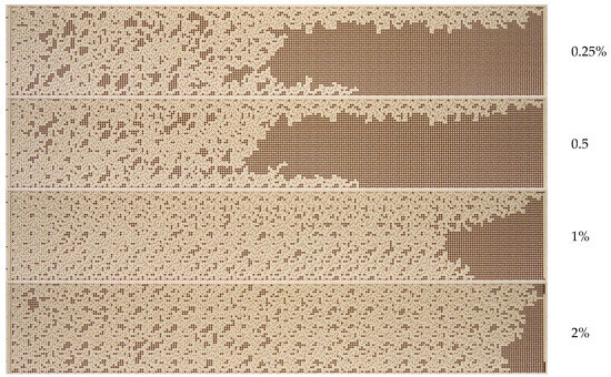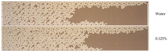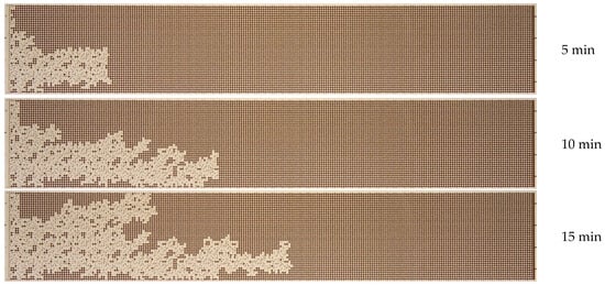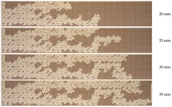 Initially, an experimental microfluidic water flooding was conducted. The microfluidic chip, which was completely filled with oil, was supplied with water at a volumetric flow rate of 0.5 μL/min. This corresponded to a capillary number of 8.4 × 10−6. The dynamics of the oil displacement process with water is illustrated in the photographs in Figure 5. The direction of the water flow is from left to right. At the outset, the water traverses the microchip channels in a relatively uniform manner. The water movement front is nearly uniform. However, as the water advances, the flooding pattern changes. The water begins to move more actively along the edges of the microchip. The central region of the microchip remains occupied by oil. Moreover, a significant portion of the oil remains behind the displacement front in the form of individual islets as well as thin films at the walls of the microchannels.