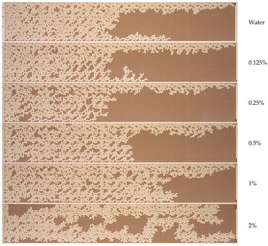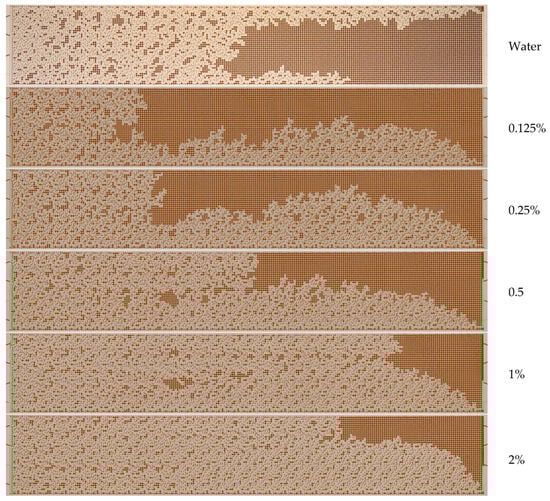 Similar experiments to avoid different results due to differences in material properties. Experiments on oil displacement from a microfluidic chip using a suspension of spherical Al2O3 nanoparticles (11 nm) were conducted. Figure 11 presents photographs of the final distribution of oil and Al2O3 suspension with different concentrations of spherical nanoparticles. Figure 12 shows the dependencies of the oil recovery factor during displacement using Al2O3 suspension with different spherical particle concentrations.