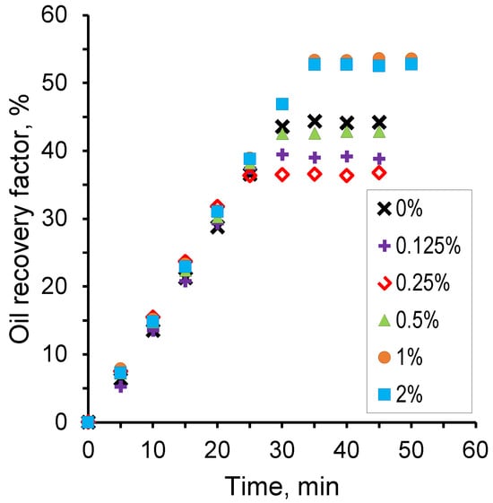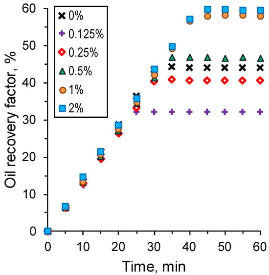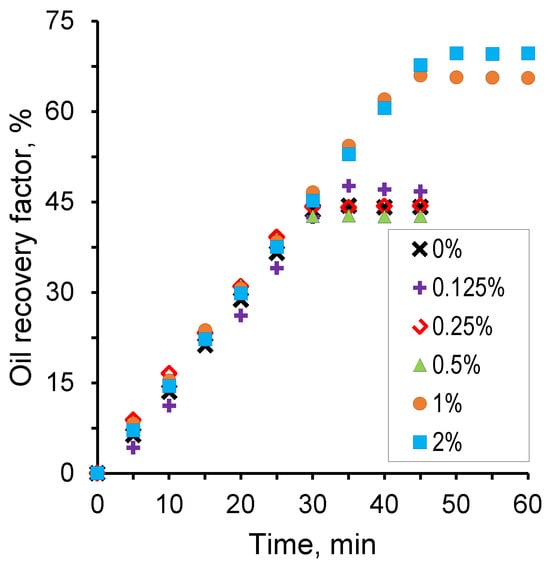 Dependence of oil recovery factor on time during displacement by SiO2 nanosuspension (22 nm) with different particle concentrations.