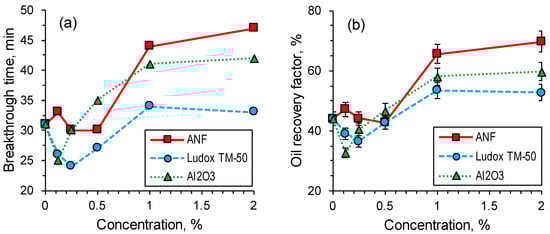 Dependence of breakthrough time (a) oil recovery factor (b) on the concentration of particles.