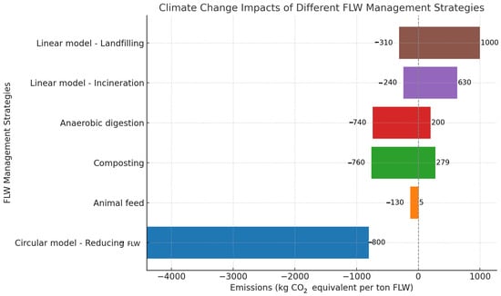 Climate change impacts of different food loss and waste (FLW) management strategies in terms of emissions (kg CO2 equivalent per ton of FLW). It visualizes the range of emissions for each strategy, with the circular model for reducing FLW having the most significant reduction potential, while landfilling shows the highest emissions in the linear model.