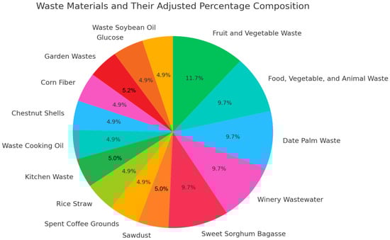Distribution of various organic wastes by percentage, highlighting the contributions of fruit and vegetable waste (11.7%), food, vegetable, and animal waste (9.7%), and other waste categories in a circular bioeconomy.