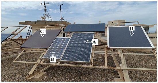 Outdoor test bench for characterizing photovoltaic modules at UDES, Algeria. (A) Si monocrystalline (c-Si), (B) Si polycrystalline (p-Si), (C) Si amorphous (a-Si), and (D) Si micromorphous (μm-Si).