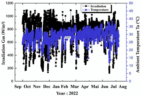 The dataset employed in this study represents a one-year period recorded in 2022; the selected period for this analysis was chosen due to the exceptional quality of our experimental data collected during this time. The data are rigorously filtered and sorted to eliminate anomalies and potential errors, ensuring the reliability of the obtained results. The measurements are conducted only during daylight hours, from 9 a.m. to 5 p.m., totaling 8 h per day. The data acquisition interval for each photovoltaic module is 10 min. Since our characterization bench is equipped with a data acquisition system for five modules, with a two-minute interval between each module, the complete measurement cycle for all modules takes approximately 10 min.