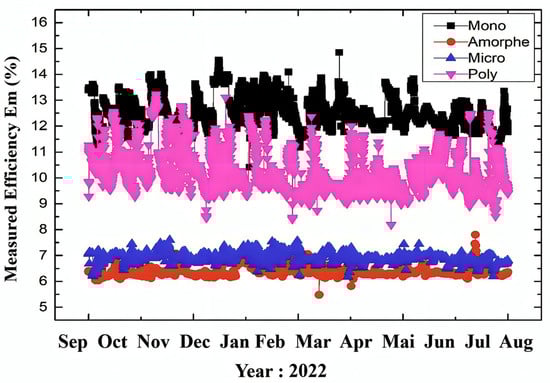 Therefore, on a daily basis, we obtained approximately 48 measurements per module (8 h/10 min/module). This theoretically gives us a total of approximately 1440 measurements per month. However, it is important to note that several factors can explain the discrepancy between this theoretical number and the actual number of recorded data points: Power outages and interruptions. Power failures or technical issues can lead to data loss. Weather conditions: Adverse weather conditions (clouds, rain) can cause temporary interruptions in measurements. System maintenance: Maintenance interventions can also disrupt data acquisition. Taking these factors into account, we estimate that an average of approximately 1000 data points per month is realistic for our experimental setup. This rich dataset offers valuable insights due to the concurrent variations in irradiance and ambient temperature, enabling the development of reliable prediction models for PV module maximum power output. Figure 2 presents the recorded values of ambient temperature Ta (°C) and irradiation G (W/m2) throughout the selected period. According to this figure, the measured irradiation exhibited values ranging from 200 to 1100 W/m2, while the average ambient temperature remained approximately 30 °C throughout the year. Figure 3 provides a comparative analysis of the measured efficiency of the four module types over a 12-month period.