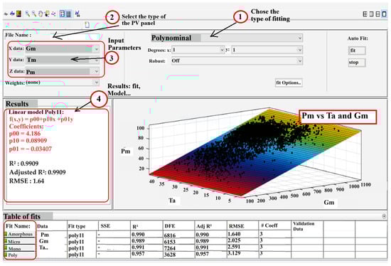 In this second method, the dependence of the measured maximum power (“Pm”) on the two parameters, measured irradiance (“Gm”) and measured PV module temperature (“Tm”), is represented by Pm = f (Gm, Tm). This relationship is modeled using the Curve Fit application in Matlab R2014a, as shown in Figure 4. This application provides an adaptable interface that enables interactive adjustment of curves and surfaces to fit the data while displaying graphical representations, as conducted by Ioan Viorel Banu et al. [] and Michael Koehl et al. []. The choice of Curve Fit in MATLAB for model development is based on its robust capabilities for nonlinear regression analysis and its widespread use in scientific research. MATLAB’s Curve Fit toolbox offers a user-friendly interface and a variety of fitting functions, making it well-suited for tasks involving complex data modeling. While other software packages and programming languages can be used for data fitting, MATLAB’s Curve Fit tool provides several advantages, including: