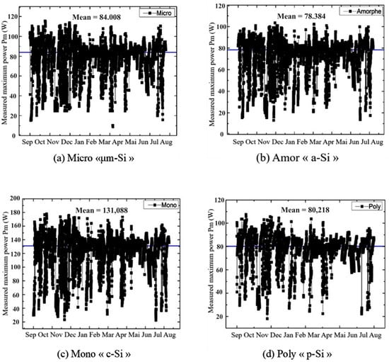 Figure 5 presents a comparison of the measured power over a one-year period for the four PV modules. This power is measured depending on meteorological parameters under real-world conditions. To gain insights into the maximum power output generation capabilities of each PV module type, Table 3 compares the measured maximum power values (Pm) in watts with the power under STC (Pstc) in watt provided by the manufacturer of each PV module. The relative error (ERpm) calculation is also presented in this table. It is observed that the maximum power output values of the three PV modules (micromorphous silicon, amorphous silicon, and monocrystalline silicon) are close to those given by the manufacturer under standardized test conditions compared to the relative error values found (“1.188”, “2.011”, and “3.959”, respectively, for amorphous, mono-, and polycrystalline). In contrast, the polycrystalline silicon module exhibits a significant relative error of “6.493” due to module degradation, as all four modules are not installed simultaneously.