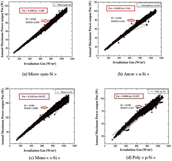 Annual Power Output “Pm” as a Function of Irradiation “Gm” for the Four PV Modules.