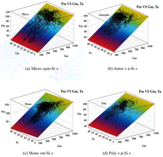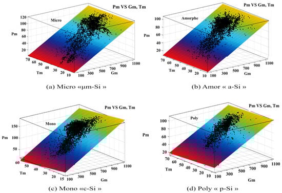 To further enhance the accuracy of estimating the maximum power generated by PV modules, the dependence on module temperature is incorporated. Figure 7 illustrates this relationship: Pm = f(Gm, Tm), obtained using the Curve Fit function for the four PV module types.