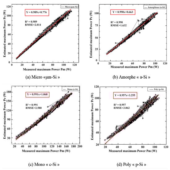 To validate the reliability of this fitting method, the results of the estimated power data (“calculated”) as a function of the real power (“measured”) are plotted in Figure 8. A linear relationship is observed with an R2 value exceeding 0.95 and an RMSE value below 3.03, validating the efficacy and robustness of the proposed method in comparison to the first method. Table 5 summarizes all the fitting equations obtained for the four PV module types, along with the calculation of R2 and RMSE errors.