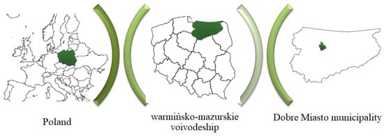 The municipality of Dobre Miasto, situated in the heart of a historical region called Warmia, was chosen for our case study. This municipality, with its 258.7 km2 of area, comprises the town of Dobre Miasto and 23 villages. The largest share of this municipality is covered with forests and farmlands. Forests and woodlands cover 9021 ha (35%) of the Dobre Miasto municipality, and the whole municipality lies within three forest districts: Wichrowo, Kudypy, and Wipsowo [49]. The municipality is moderately industrialised. Its main functions are industries and services, while agriculture plays a complementary function, even though it is the main source of income for most of the rural population [49]. What is unique about this municipality is its location—Dobre Miasto lies in the heart of historic Warmia. The shape of Warmia’s territory resembles a triangle with one of the vertices touching the Vistula Lagoon. The area submitted to our study and its location are illustrated below (Figure 1).