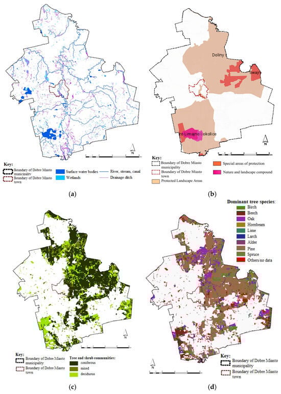(a). Surface water bodies in the area submitted to the study [58]. (b). Areas submitted to legal nature conservation in Dobre Miasto municipality [58]. (c). Trees and shrubs in the area submitted to the study [58]. (d). Dominant species of trees in the Dobre Miasto municipality [58].