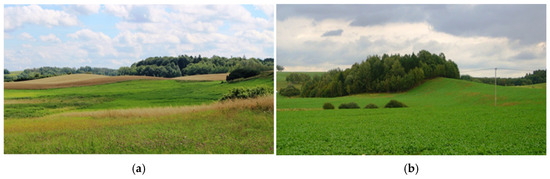 Warmia’s landscape was shaped under the impact of the last Baltic Glaciation. As the climate was warming, the glacier was slowly retreating from this territory, and wherever the glacier front stopped for a longer time, chains of terminal moraines formed. This is how six moraine embankments appeared in Warmia [59]. High diversity of the land relief can be observed in the Dobre Miasto municipality, which lies in the valley of the Łyna River. The municipality’s territory encompasses uplands of bottom and terminal moraines, sander, and a few river valleys, like ones carved by the Łyna River and its tributaries: the Kwiela and the Kisna. The northern part of the municipality features undulating hills, clearly rising southwards (Figure 3a,b) [60].