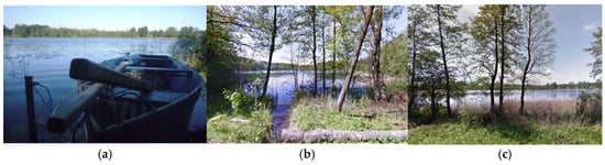 Examples of lakes in the Dobre Miasto municipality (source: own photographs). (a) Limajno Lake; (b) Pupla Duża Lake; (c) Kominek Lake.