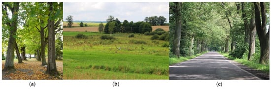Examples of greeneries typical for Warmia (source: own photographs). (a) Preserved old trees in the Park in Smolajny; (b) In-field trees in the Dobre Miasto municipality; (c) A roadside tree alley—lime trees—between Nowa Wieś and Dobre Miasto.