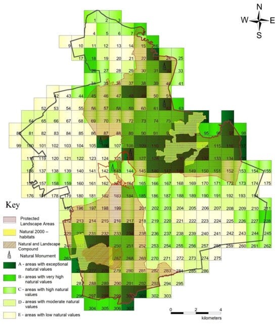 The Dobre Miasto municipality’s area is comprised within eight squares with a side of 10 × 10 km, assigned the letter–digit codes EB 11, EB 12, EB 21, EB 22, EB 23, EB 31, EB 32, and EB 33. In order to localise the grid in the field, the centrally located square EB 22 was chosen, and its coordinates were plotted on a map with a scale of 1:25,000. Following the division of the studied area into primary fields, 307 squares were obtained, with 103 squares situated on the border of the municipality, having the area of less than 1 km2 ([50] (Figure 7)). The valorisation scores were assigned to all distinguished research units of the municipality, developed graphically, and evaluated.
