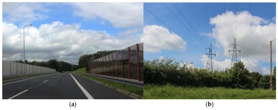 A detailed analysis of the state of natural landscape preservation in the context of the presence of degrading elements, having a negative impact on the perception of landscape in the analysed area, revealed the recurrent presence of the same elements. The perception of the natural landscape was distorted when such objects were present in its proximity: a grid of paved roads, especially ones with road noise barriers (Figure 8a), photovoltaic installations to power road signs [57,66], railway tracks and often their immediate surroundings, various pieces of the power grid (e.g., power poles, high-voltage lines) (Figure 8b), or illegal landfills, most often found near villages, along roads, in ditches, or on lake shores.
