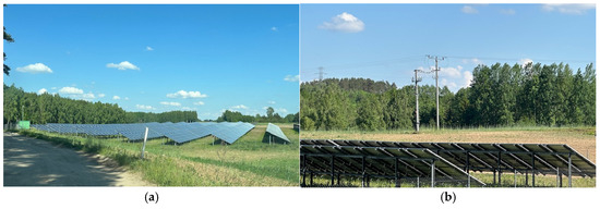 Example of an industrial photovoltaic farm in the Dobre Miasto municipality (source: own photographs). (a) photovoltaic farm; (b) new technical infrastructure.