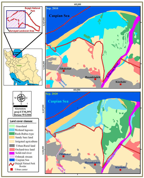 Land cover changes in Bujagh were surveyed over a two-year period. We used images from September 2010 captured by the TM sensor of Landsat 5 and images from September 2020 captured by the OLI sensor of Landsat 8, which were obtained from the USGS website.