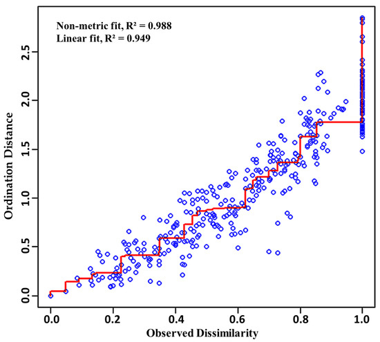 Shepard plot display compatibility and goodness of fit by using NMDS ordination. blue circle: denote observed dissimilarity between samples distance; red line: is a linear fit on basis squared correlation between fitted values and NMDS distances.