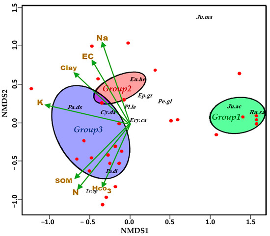 In the subsequent step, we analyzed the relationship between dominant species and soil chemicals based on NMDS components. As shown in Table 5, holly bramble and spiny rush in group 1 exhibited the longest gradient and significant correlation in the structure of NMDS axes (R2 = 0.75, 0.78; p-value < 0.001). However, no correlation was observed between these species and the slope of changes in the soil chemicals matrix (Figure 5). Non-edaphic variables or anthropogenic factors may have contributed to the gradual dominance of these plants in the grassland territory. The sea rush (J. maritimus) from this group showed co-linearity with high sodium concentration, but the correlation between that and NMDS axes shows low significance (R2 = 0.20; p-value < 0.02). The dominant plants of group 2 made a weak contribution to the structure of the plant community based on NMDS components (Table 5), except for Bermuda grass (C. dactylon), which had co-linearity with low-to-medium levels of sodium (Na), electrical conductivity (EC), and clay texture (Clay). The main species of group 3 have notable compatibility with the NMDS2 axis (R2 = 0.63–0.75; p-value < 0.001), and two common clover species (T. repens, T. fragiferum) had a significant correlation with extreme levels of soil organic matter (SOM), total nitrogen (N), and bicarbonate (HCO₃), while dallisgrass (P. dilatatum) contributed in low-to-moderate levels of these factors. The common knotgrass (P. distichum) played a key role in the formation of the plant community (R2 = 0.75; p-value < 0.001) and had a high correlation with medium to high levels of potassium (K), electrical conductivity (EC), and clay texture (Clay). Figure 5 shows the variation coincidence of plant groups and their dominant species with the soil chemicals and their changes on the NMDS axes; note that the weighted factors are merely drawn based on confidence degree at a p-value of less than 0.05 in Figure 5.