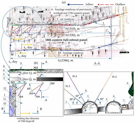 Mountain-geological conditions of the 18th eastern longwall mine on a seam m3: (a)—top view, a plan of mining operations along seam m3 and stages of panel development (t1 t2, …); (b)—schematic representation of wells (with inclination angles β) drilled at the 133rd and 13st pickets; A−A—section drawn perpendicular to the roadway and parallel to the face (with boreholes azimuths φ); B−B—section made perpendicular to the face; No. 1, 2, 3, 4—methane drainage boreholes; 1—seam m3; 2—degasification pipeline; 3—air roadway of the 18th eastern panel; 4—casing; 5—coal pillar; 6—haulage air roadway of the 17th eastern panel (which has been fully worked out up to this time); 7—auxiliary construction to protect the roadway; 8—mined-out space (goaf); 9—technogenic reservoirs of a mine methane inseam under a working zone of the previously mined panel of the 17th eastern longwall; 10—technogenic reservoirs of mine methane in the mined-out space and a seam under a working zone of the seam m3; 11—18th longwall; 12—goaf 18th eastern longwall; 13—haulage roadway.