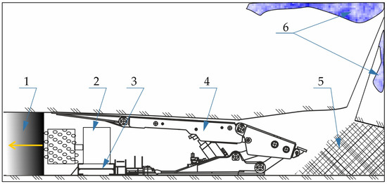A section B−B indicated in Figure 1 made perpendicular to the working face: 1—coal seam m3; 2—schematic representation of a shearer loader with rows of teeth on the executive body; 3—flight conveyor; 4—section of a powered support in a longwall; 5—goaf 18th eastern longwall; 6—technogenic reservoirs of mine methane in a mined-out space and a seam under a working zone of the seam.