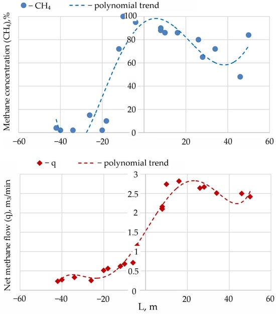Not without its limitations, but the general nature of the nonlinearities in terms of the methane concentration distribution, when the main roof span described in this research increases, is similar to the mechanism of stress changes occurring in the roof and the surrounding roof rocks, as stated in Figure 18 of source [67]. Unlike similar methods for assessing degassing productivity and volume of mine methane extraction, the authors’ method allows us to quantify gas losses due to the failure of a local degassing network. The reasons may be different, but basically it is the failure of wells associated with the peculiarities of changes in the stress–strain state in the rock mass [68,69,70,71,72].