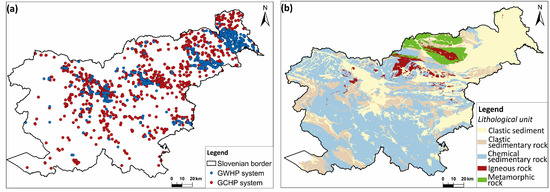 The collection of material for this study consisted of gathering spatial data on natural conditions in Slovenia (Figure 2) and selected European countries. We then collected different databases on GSHP systems in Slovenia and selected a database containing the geographical locations of installed GSHP systems for further statistical analysis (Figure 2a). To our knowledge, the chosen statistical methods (χ2 test and information value method) were used for the first time to assess the influence of natural conditions on GSHP distribution. However, they have already been used to assess the influence of natural factors on the spatial distribution of observed phenomena, e.g., in landslide hazard analysis and disease mapping [30,31,32,33].