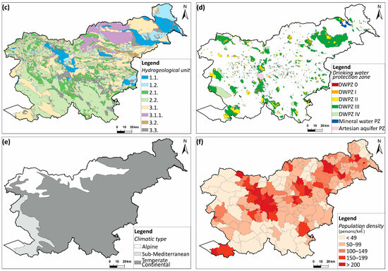 The spatial analysis of the natural factors was performed in a GIS environment [48] with the shapefiles of the geological [34], hydrogeological [35], and climatic [37] maps of Slovenia. The area and population density shares of the individual classes within the factors were calculated. The units of the geological map (Figure 2b) were classified into 5 geological classes: clastic sediments, clastic sedimentary rocks, chemical sedimentary rocks, igneous rocks, and metamorphic rocks. The hydrogeological map (Figure 2c) is consistent with recommendations of International Association of Hydrogeologists (IAH) and is divided into 8 main groups based on the type of porosity and aquifer yield (Figure 2b): 1.1. Extensive and highly productive intergranular aquifers, 1.2. Local or intermittently productive aquifers or extensive but only moderately productive intergranular aquifers, 2.1. Extensive and highly productive fissured/compacted aquifers, 2.2. Local or intermittently productive aquifers or extensive but only moderately productive fissured/compacted aquifers, 3.1. Minor aquifers with local and limited groundwater resources, 3.1.1. Minor aquifers with local and limited groundwater resources (metamorphic, igneous), 3.2. Areas with essentially no groundwater resources, and 3.3. Aquitards overlaying aquifers of type 1. or 2. [49]. Three climate types are typical for the territory of Slovenia: Temperate Continental, sub-Mediterranean, and Alpine (Figure 2e) [37]. The average population density in Slovenia is 104 people/km2. For the analysis, the distribution of the population at the municipality level was used (Figure 2f) [38].