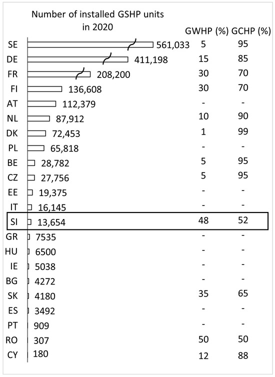 - The shares of GCHP (51%) and GWHP (49%) systems installed in Slovenia in the time interval 2016–2021, registered in the Eco Fund database, are comparable. The share of GWHP systems is among the highest in European countries.