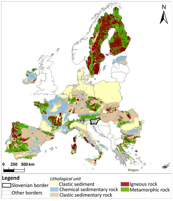 - Novak, M. Lithological Composition. In Geological atlas of Slovenia, 2nd ed.; Novak, M., Rman, N., Eds.; Geological Survey of Slovenia: Ljubljana, Slovenia, 2018. [Google Scholar]