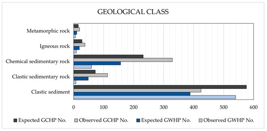 Number of observed and expected GWHP and GCHP units on geological classes.