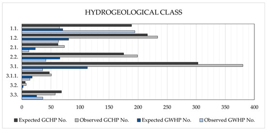 Number of observed and expected GWHP and GCHP units on hydrogeological classes.