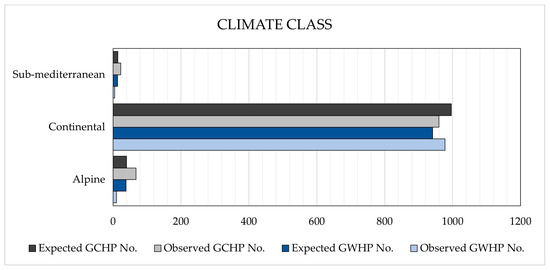The χ2 test showed that the geological, hydrogeological, and climatic classes have a statistically significant influence on the GSHP systems’ spatial distribution (Table 3, Figure 5, Figure 6 and Figure 7). The highest probability that natural conditions influence GSHP spatial distribution was found for hydrogeological conditions (χ2 = 296), followed by geological conditions (χ2 = 160) and climatic conditions (χ2 = 28) for GWHP systems. The same ranking of factors was obtained for GCHP systems. In this case, the χ2 values are lower but still indicate a strong influence of natural factors: 110 for hydrogeological conditions, 108 for geological conditions, and 26 for climatic conditions. More detailed results for each factor class are presented in Table 3.