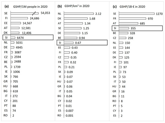(a) Number of operating GSHP systems per million people in 22 European countries, (b) per square kilometre, and (c) per GDP in 2020 [46,47,53,54,55].