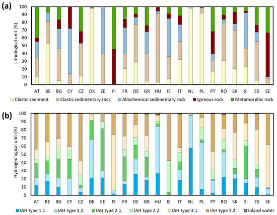 (a) Share of geological classes and (b) hydrogeological classes in selected EU countries.