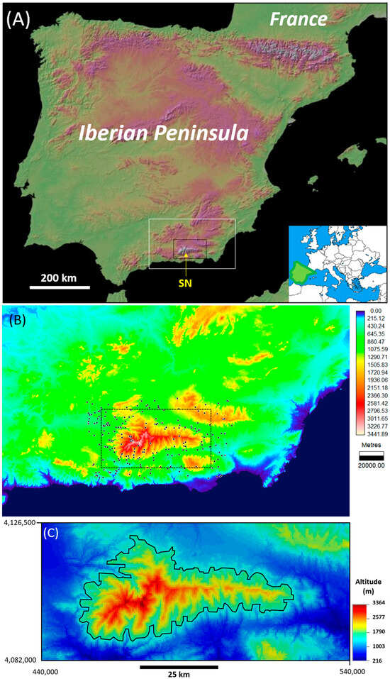 These and other previous studies have estimated precipitation and temperature over large regions, such as the entire Mediterranean region or the whole of the Iberian Peninsula, without any altitudinal restriction. The work presented here focuses on precipitation and temperature within the high-altitude area of the Sierra Nevada mountain range, and specifically, on the connected region with altitudes from 1500 m above sea level (asl) to almost 3500 m asl, which comprises the most southern alpine environment in Europe. The objective was to build a database of daily precipitation and temperature within this high-altitude area and to interpret it by using various statistical analyses, as explained in the following sections. This database reveals the spatio-temporal evolution of water resources in the studied area.