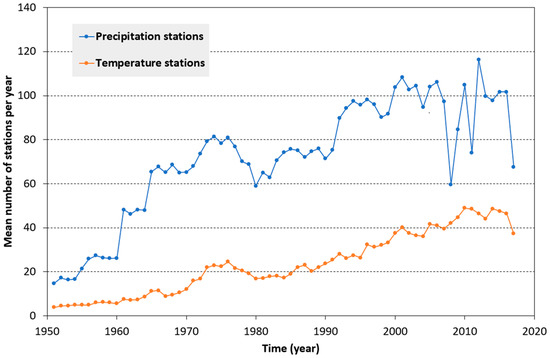 26]. Co-kriging is used to estimate daily precipitation and temperature on a regular grid, and seasonal and annual averages are estimated by summing the days contained in the chosen time period (or support in geostatistical terminology) of estimation (e.g., one month, one season, one year). As the number of rain gauges and temperature stations available for any particular day may be small, a climatological variogram is used [