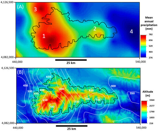 Figure 3A), while the maximum precipitation in Summer occurred in the second maximum of precipitation inside the target area, located in the eastern part of the Sierra (number 2 in