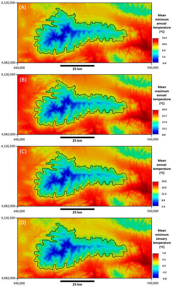 Figure 5A–C, respectively. Because of the high negative correlation between temperature and altitude, the temperature maps in