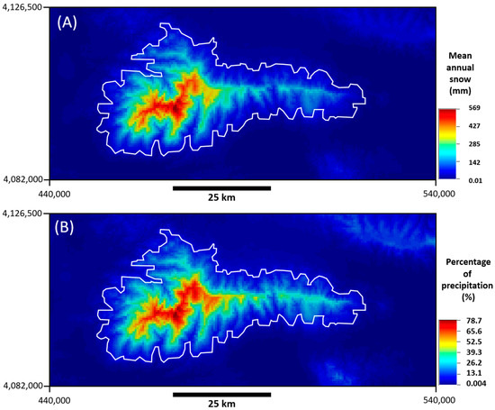 Figure 6B shows that the percentage of total precipitation that fell in the form of snow increased with altitude and, within the Sierra Nevada mountain range, varied from 4.2% to 78.7%, with a mean of 24.9%.