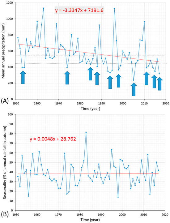 Figure 7B, in which it is clear that seasonality has remained unchanged over the 1951–2017 period. Seasonality has been defined as the percentage of annual precipitation occurring in Autumn, because Autumn is the main wet season in the area, recording, on average, 40% of the precipitation of the whole year.