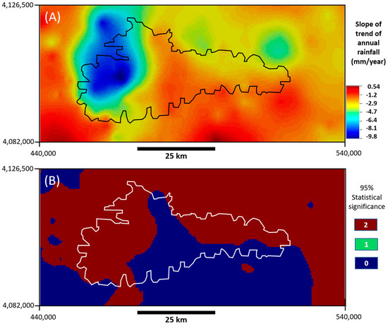 Figure 7A. The mean annual precipitation of 575 mm is represented as a horizontal, large-dashed line. The high variability of annual precipitation over the years is reflected in a time series with a standard deviation of 191 mm. Despite this high variability, the annual precipitation decreased linearly at a rate of 33 mm of precipitation per decade. The negative slope is statistically significant (i.e., differs from zero), with a confidence level of 95%. The fitted linear trend is shown as a solid red line in