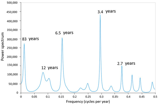 Figure 9. There are important cycles lasting around 12 years, related to sunspot cycles. A cycle of 83 years is also related to solar activity but is less reliable because it is longer than the length of the time series of the available data. The cycles of 6.5, 3.4, and 2.7 years are related to the North Atlantic Oscillation (NAO) index.