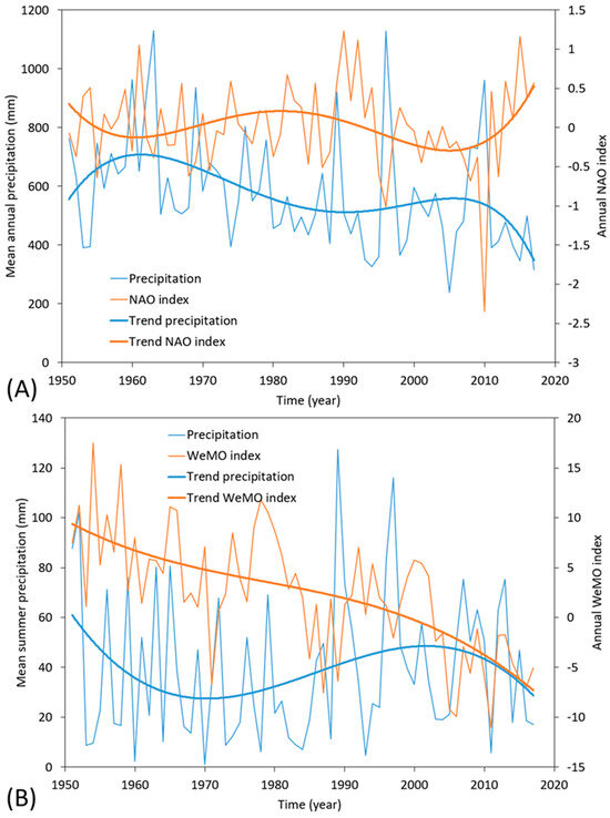 Figure 7A. This decrease can be seasonally decomposed as a decrease of 15 mm in Winter precipitation, 12 mm in Autumn precipitation, and 6 mm in Spring precipitation, while there was no significant change in Summer precipitation. In addition, the years with the lowest precipitation coincided with droughts in southern Spain or in the entire Iberian Peninsula and have been marked with blue arrows in