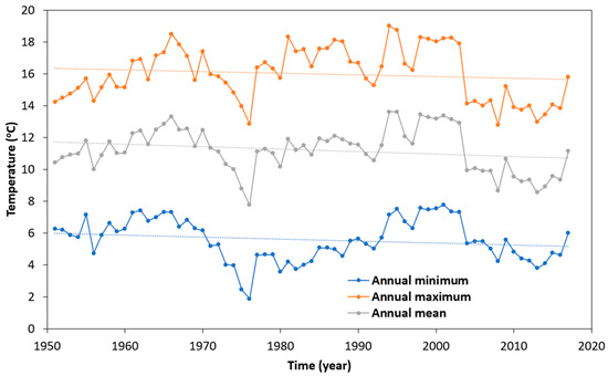 Another important result is the mean annual temperature (minimum, maximum, and mean) in the Sierra Nevada for the period from 1951 to 2017, which is represented in