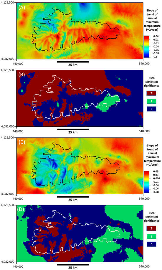Figure 12B,D shows the statistical significance of the different slopes. For both minimum and maximum temperatures, there are positive and negative trends, together with areas that are not statistically significant (at the 95% confidence level), areas that have positive slopes that are statistically significant, and areas that have negative slopes that are statistically significant. For both minimum and maximum temperatures, the statistically significant positive slopes (increasing temperature with time) are in the eastern part of the mountain range, while the statistically significant negative slopes (decreasing temperature) are in the western part of the mountain range.